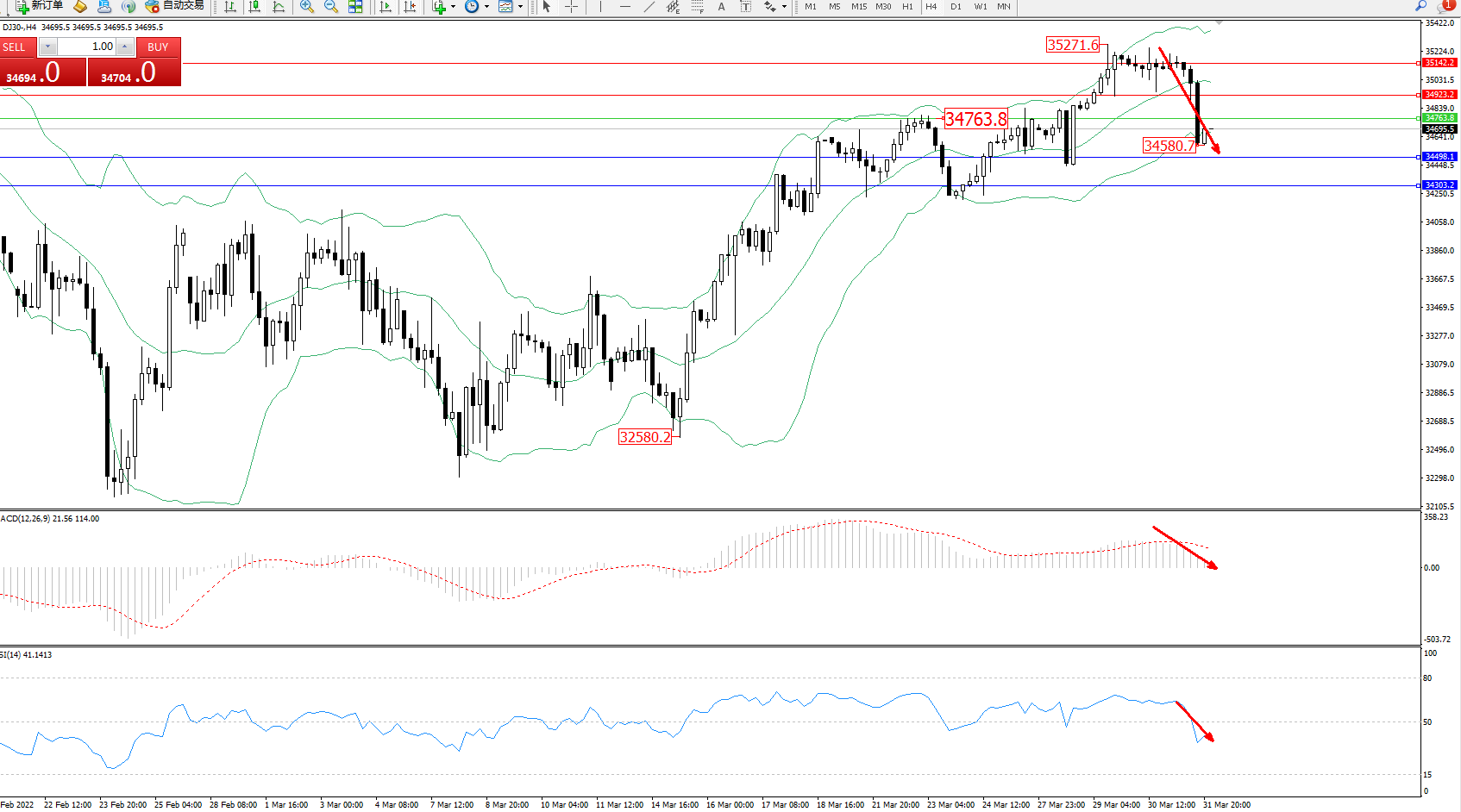 技术点评:高位短期维持整理平移后,空头动力伺机入场,急速下挫,抵达34580位置节点后开始整理,短期空头动力有继续向下移动态势,布林带指标呈高位呈收口走势持续中,MACD指标处于多头区域维持整理缓慢下行至0轴线附近徘徊,RSI指标空头动力急速下挫至50均衡线下侧整理中;
