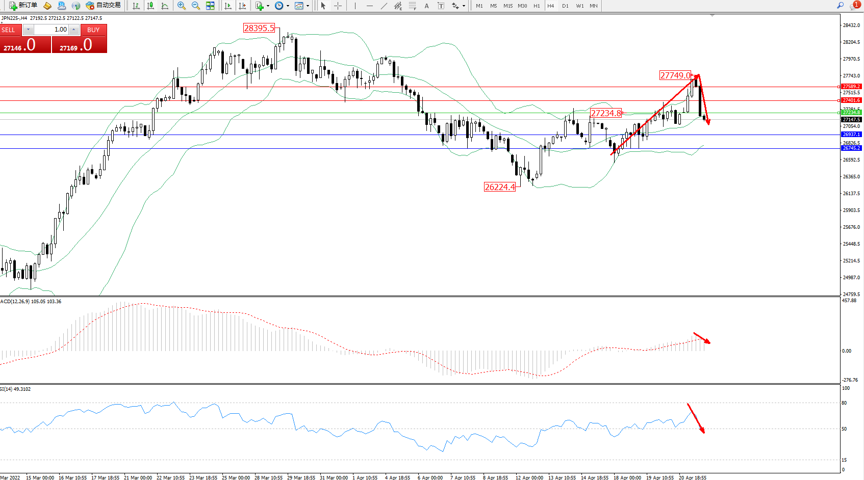 技术点评:多头动力延续布林带指标通道中上轨区间持续震荡上扬,高位抵达27749附近节点后遇阻回撤,短期触及布林带指标中轨附近节点后有继续下行迹象,布林带指标呈缓慢张口走势后开始逐渐收口,MACD指标处于多头区域维持震荡缓慢下行,RSI指标处于多头区域维持震荡下行至50均衡线附近徘徊;
