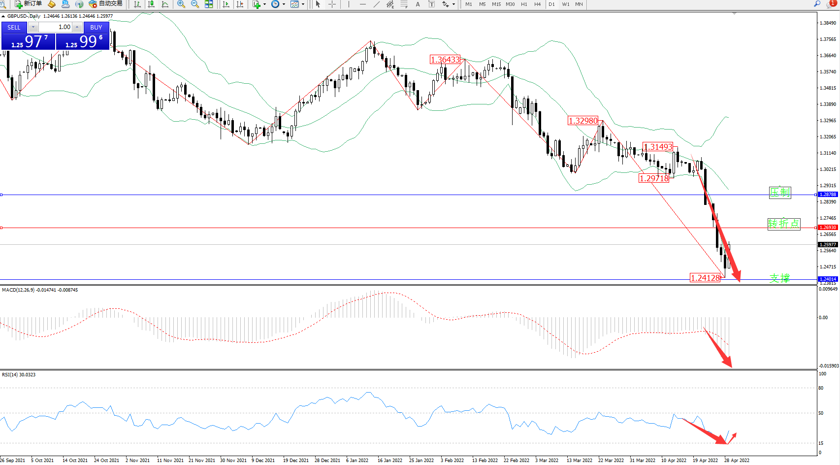 空头动力急速下挫,延续布林带指标下轨不断下移至1.24128附近节点后反转,市场空头下行态势良好,布林带指标呈张口走势中,上方压制关注1.28788附近,低位支撑关注1.24014附近节点,关注1.26930附近转折点,MACD指标处于空头区域维持震荡不断下行中,RSI指标指标处于空头区域维持震荡下行至超卖区15均衡线上側徘徊,如图: