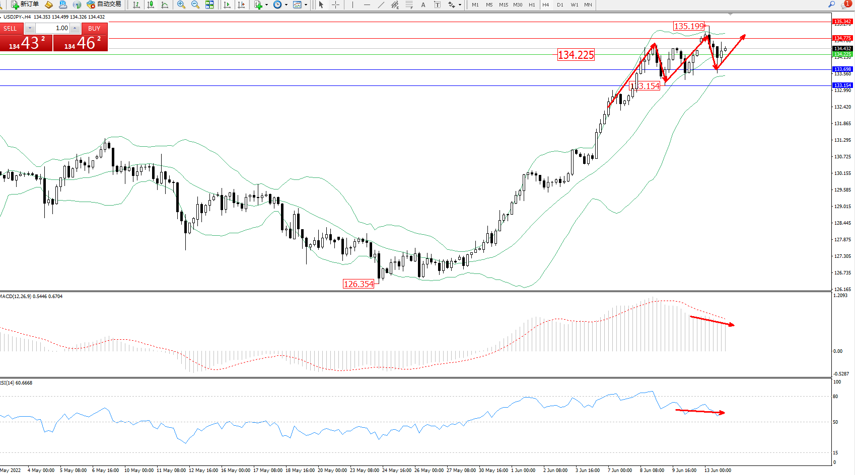 交易策略:134.225上方看涨,目标134.775、135.342