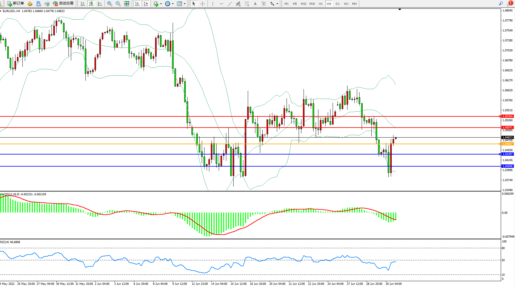 欧元美元EURUSD—4小时K线图显示: