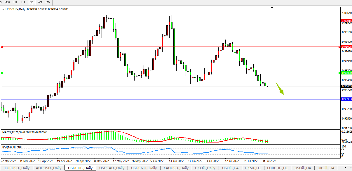 交易策略:0.9600下方看跌,目标0.9400、0.9200