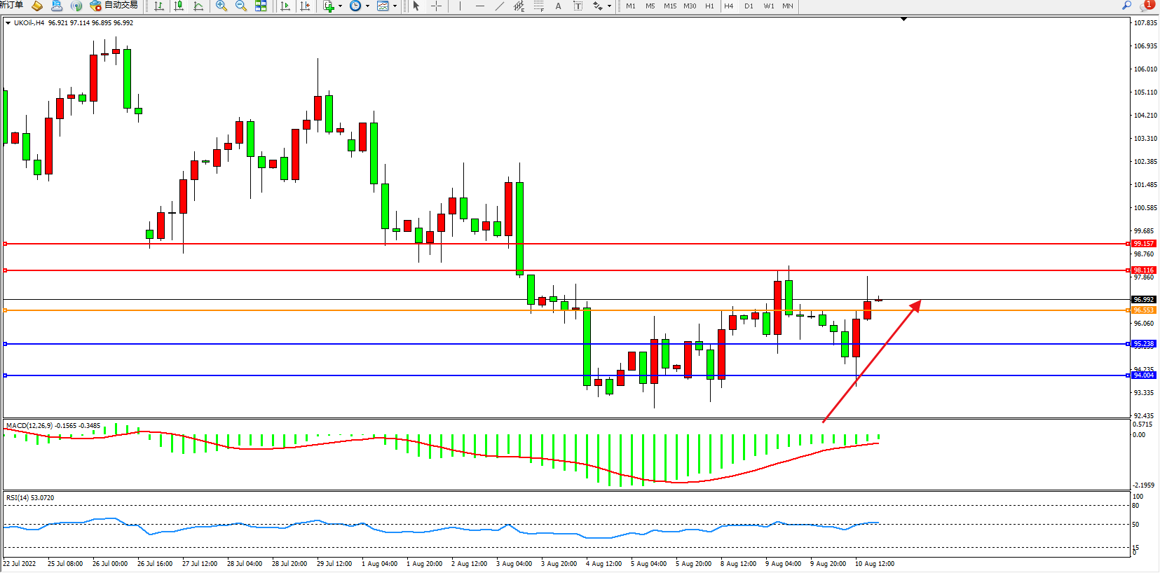 布油维持96.992附近震荡, 美国截至8月5日当周原油出口量为2022年1月7日当周以来最低;国内原油产量为2020年4月17日当周以来最高。