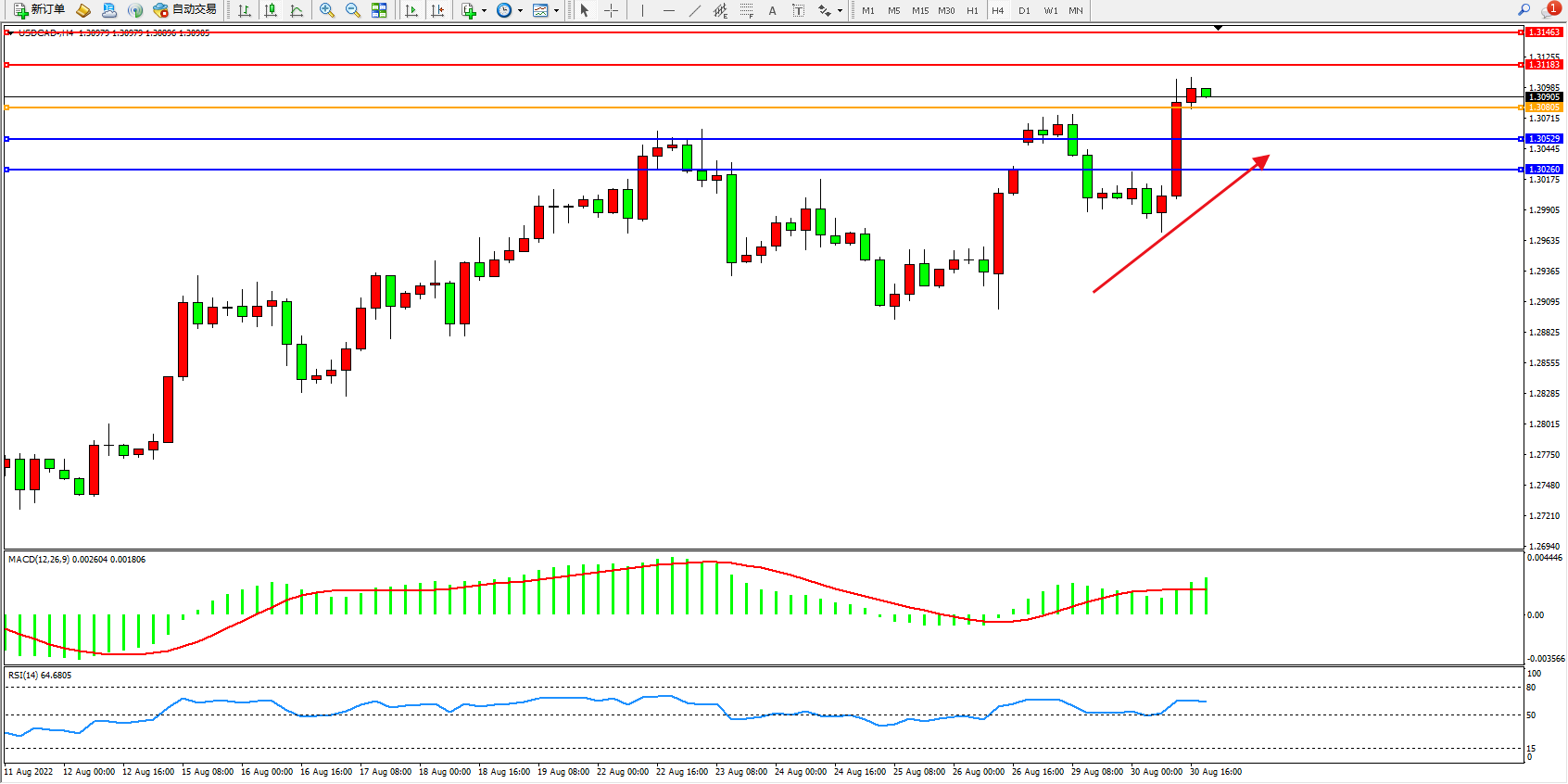 美元兑加元维持1.30905附近震荡,加拿大实际GDP应该与第二季度的预期基本一致,6月份的月度GDP,以及已经公布的一些7月份的最早指标,都显示出显著的减速。不过,除非加拿大第二季GDP数据大幅低于预期,考虑到近期核心通胀数据的动能,加拿大央行似乎仍可能选择9月加息75个基点。