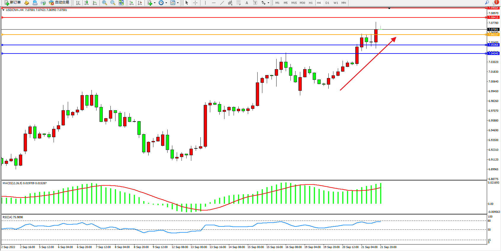 备选策略:7.06327下方看跌,目标7.05068、7.04040