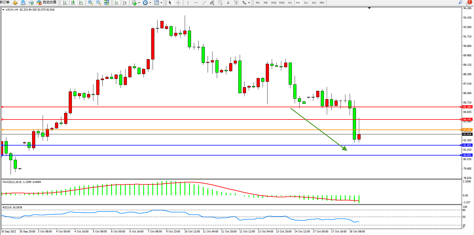 4小时图看:空头动力持续震荡下行,短期跌势未见止步,市场空头情绪笼罩,短期有继续向下移动态势,MACD指标处于0轴线下侧徘徊,RSI指标处于50均衡线下侧空头区域弱势整理;