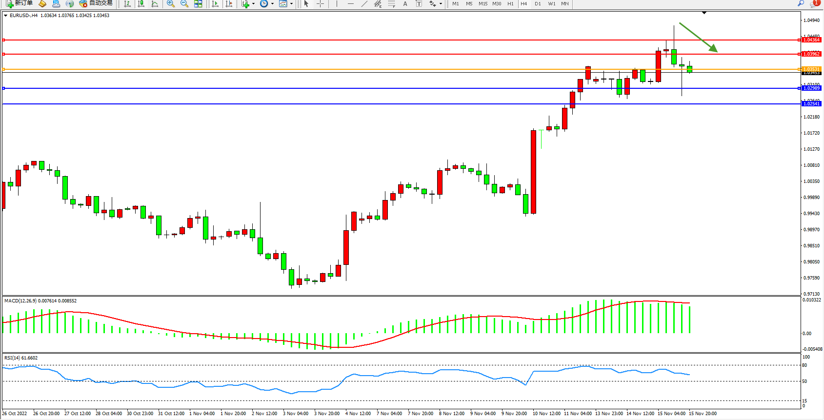 4小时图看:多头动力持续震荡上移后,高位遇阻短期震荡回撤,市场空头情绪开始缓慢入场,MACD指标处于多头区域高位整理,RSI指标处于多头区域高位徘徊;