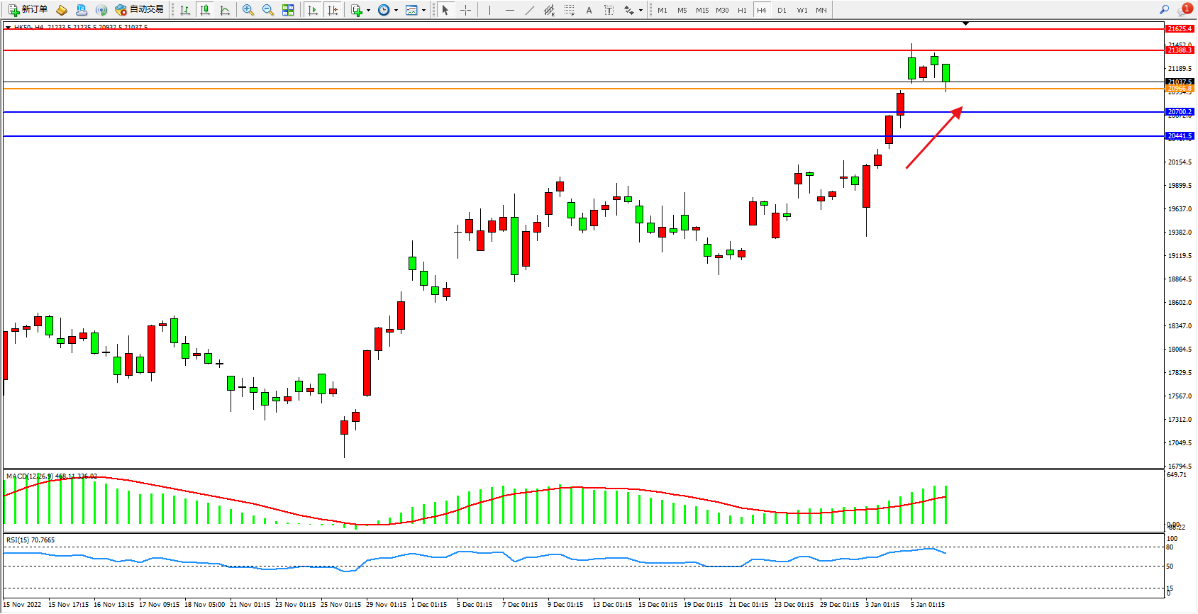 香港恒生指数1月6日(周五)收盘下跌60.53点,跌幅0.29%,报20991.64点;连续上涨的港股终见回调,本周三大指数呈现先扬后抑行情,但总体仍大肆向好,迎来2023年首周开门红。连续单边上涨的大型科技股走势分化,阿里巴巴、京东、百度维持上涨行情,美团跌超4%,南下资金净流入11.12亿港元,大市成交额为1482亿港元。