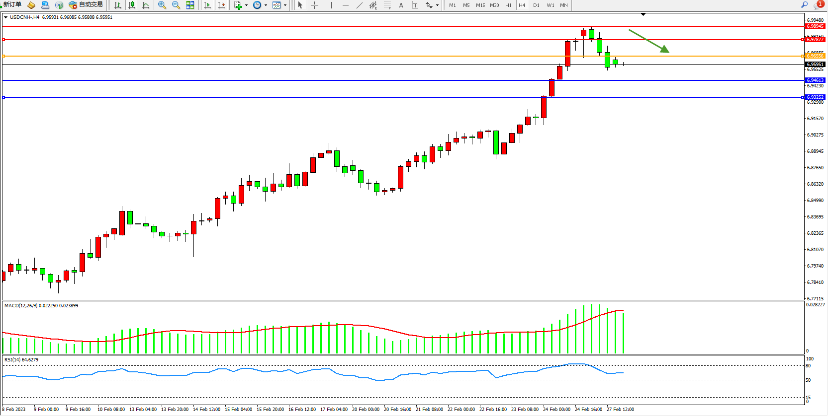 交易策略:6.96556下方看跌,目标6.94613、6.93252
