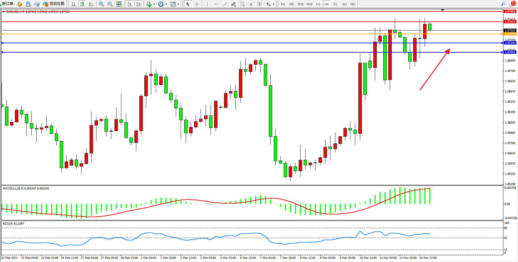 4小时图看:高位多头动力维持震荡上移,短期看涨情绪笼罩,市场多头持续移动中,MACD指标处于多头区域高位徘徊,RSI指标处于50均衡线上側弱势整理;