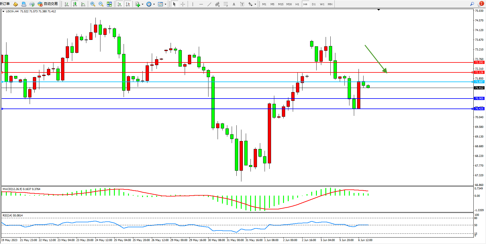 4小时图看:空头动力震荡向下移动,短期跌势或将延续,市场整体处于偏空头趋势中,MACD指标处于0轴线上側弱势徘徊,RSI指标处于50均衡线附近弱势整理;