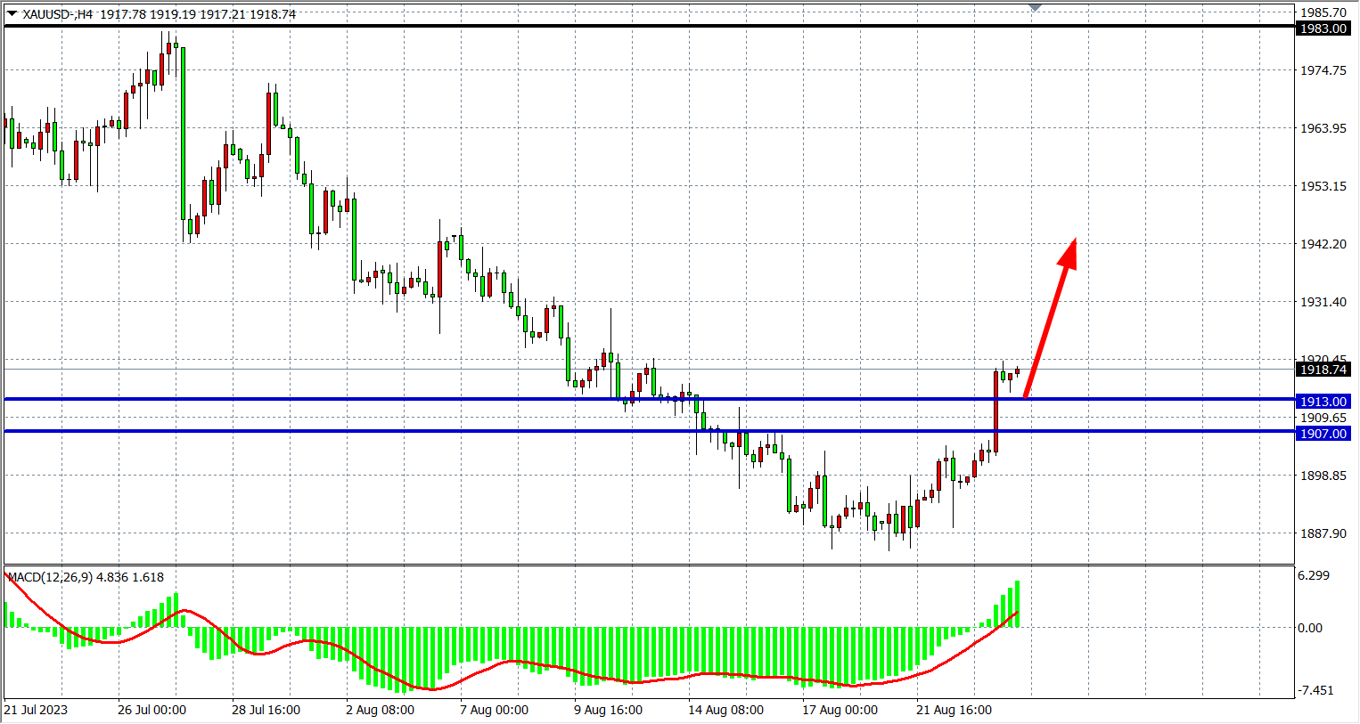 4小时图看,黄金在一鼓作气突破1910关口,MACD量能在零轴上放量,短线走势多头强劲,支撑上移1913-1907附近,阻力关注上方1930-1940附近。